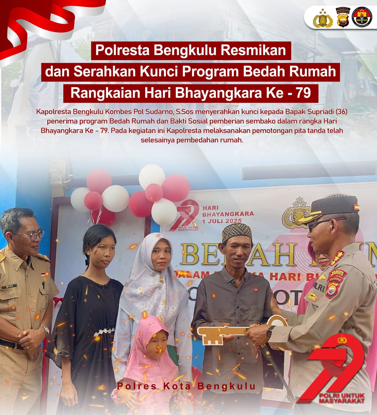 Bengkulu aktualklick.com Kapolresta Bengkulu, Kombes Pol Sudarno, S.Sos, M.H., menyerahkan kunci rumah kepada Bapak Supriadi, penerima program Bedah Rumah dan Bakti Sosial dalam rangka Hari Bhayangkara Ke-79. Kegiatan ini juga dirangkaikan dengan pemberian sembako dan pemotongan pita tanda selesainya pembedahan rumah.senen 30/6/2025.
